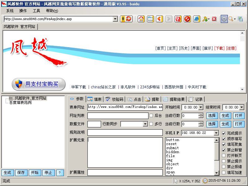 风越网页表单自动、批量填写工具,可自动分析网页中表单已经填写的内容,保存为填表规则,以后填表时,只需调用此规则即可,同时可提取网页文本、下载指定文件。
