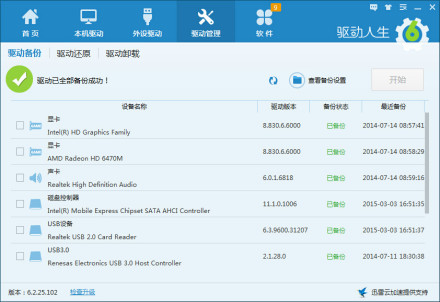 更新、备份、还原画面进行操作。另外还在右侧窗口显示推荐功能及资源情况如:CPU、内存、硬盘使用情况。还有温度情况实时监控。%20方便、快捷、智能的的硬件识别检测,全自动检测电脑硬件,自动匹配官方驱动。为用户的硬件更新最新的驱动程序。驱动人生的目标是检测识别所有硬件,并自动为您的计算机下载安装稳定性最好、性能最高的驱动程序。%20驱动备份点击“驱动管理”标签进入驱动备份画面,勾选你想要备份的设备,您只需点一下鼠标确认即可轻松完成。在系统故障、重装系统不用再发愁,简单快速完成驱动恢复。%20驱动还原