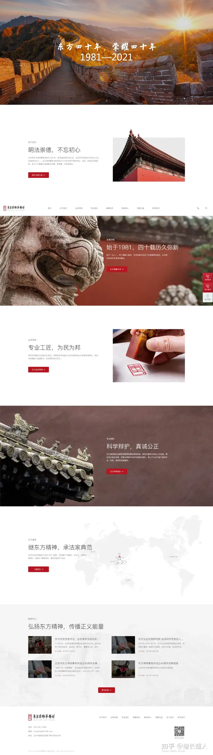 例如我们为北京东方律师事务所新官网的整体风格进行了定义与统一,得出「专业」、「历史感」、「严谨」这三个品牌感知关键词,使新官网的视觉风格及调性有明确的设计方向。